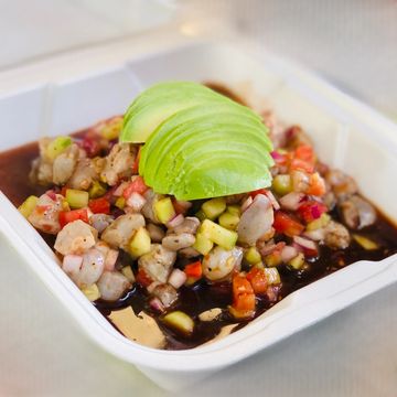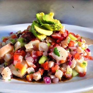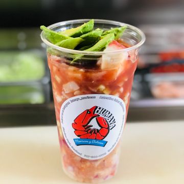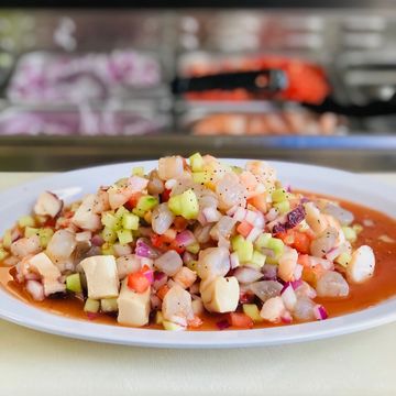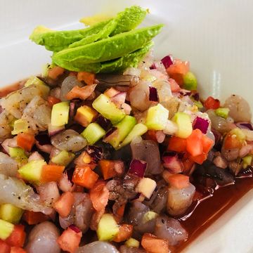 CEVICHE DE CAMARON COCIDO, CAMARON CURTIDO, PULPO, ABULON, CALLO DE HACHA.