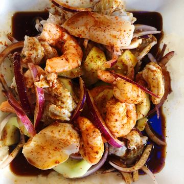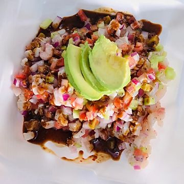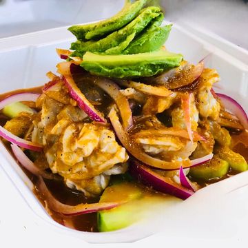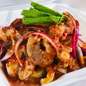 SHRIMP WITH SPICY RED SAUCE, RAW RED ONION, CUCUMBER AND TOPPED WITH AVOCADO
