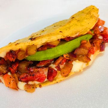 GRILLED SHRIMP, CHEESE TACO WITH RED ONION AND LETUCE-FLOWER TORTILLA